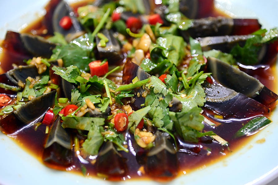 凉拌皮蛋,大大一盘,黑亮的皮蛋点缀着青翠的香菜,美轮美奂,吃起来清香爽口,胃口大开。