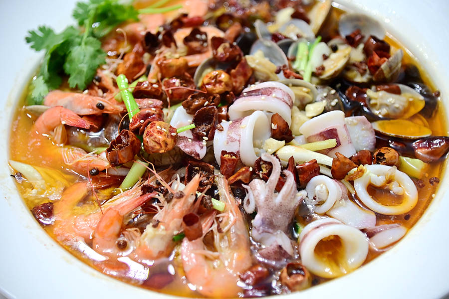 水煮三鲜,一上桌就香气四溢,粉红的虾,白嫩的小管,嫩黄的花蛤,一看就让人食指大动。食材新鲜优质,口感紧实弹牙,滋味麻辣鲜香,一会就瓜分一空,连配料都很好吃!