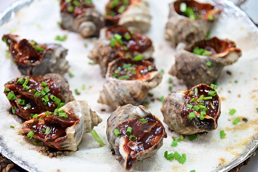 盐焗香螺,大颗的香螺摆放在洁白的盐上,造型精美,螺肉大颗饱满,新鲜弹牙,烹制的有滋有味,咸鲜可口,爱不释手。