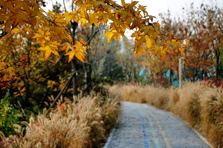 而在黄昏,阳光透过云彩,喷洒出一道道霞光,把公园照得一片金黄。远处则是新落成的村民新区,栋栋白墙灰瓦的江南住宅映衬着水景,闲适怡人。