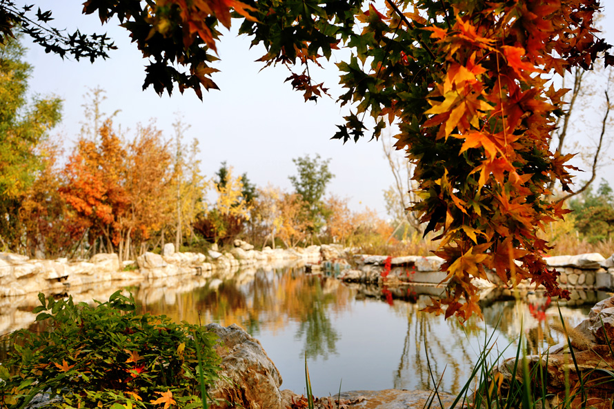 一阵秋风吹过,黄色的银杏树叶飘落下来,落在草地上,黄绿相间,放眼望去,色彩斑斓……近日,北京通惠水谷湿地公园迎来落成后的首个最美季节。
