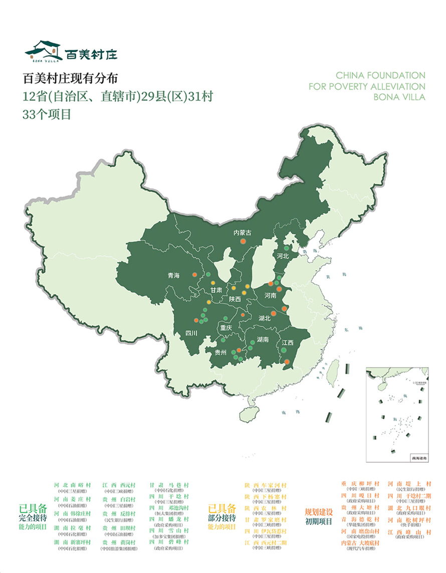 截至 2022 年5 月,项目分布在全国河北、河南、甘肃、陕西、贵州、湖南、四川、江西、重庆、青海、内蒙古、湖北等12省(自治区、直辖市)29县(区)31 村,共计 33个项目。