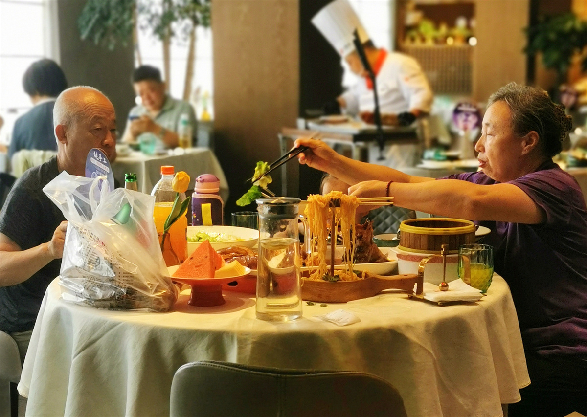 金牌烤鸭是这里的绝对主角,店堂中最忙碌的莫过于烤鸭和片鸭师傅。明档前,烤鸭师傅娴熟地在烤炉中调换鸭子位置,确保每只鸭都烤得均匀油亮;片鸭师傅则精心将烤熟的鸭子片下码盘,每一片都厚薄适中、肥瘦相宜。一盘烤鸭上桌,油光锃亮的鸭片整齐码放,宛如一件精美的艺术品。大堂里,老两口带着孙女过生日,饭桌上流淌着浓浓的喜气;邻桌的大人孩子是来自外地的亲戚,正美美地品尝着地道的北京烤鸭,眼神里流露着满足。