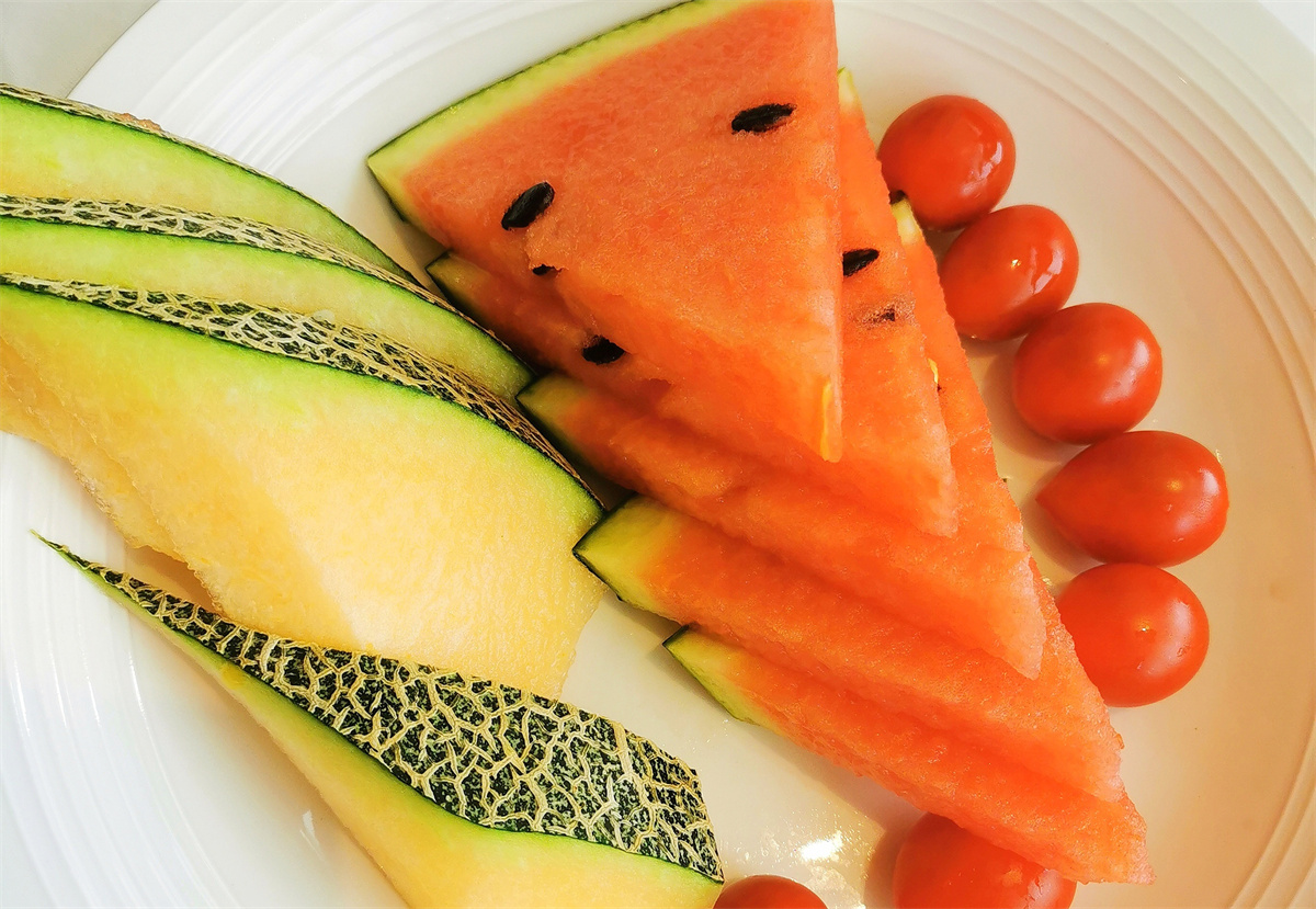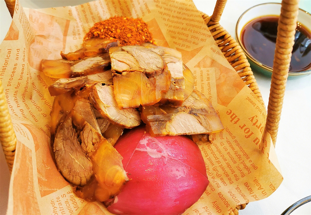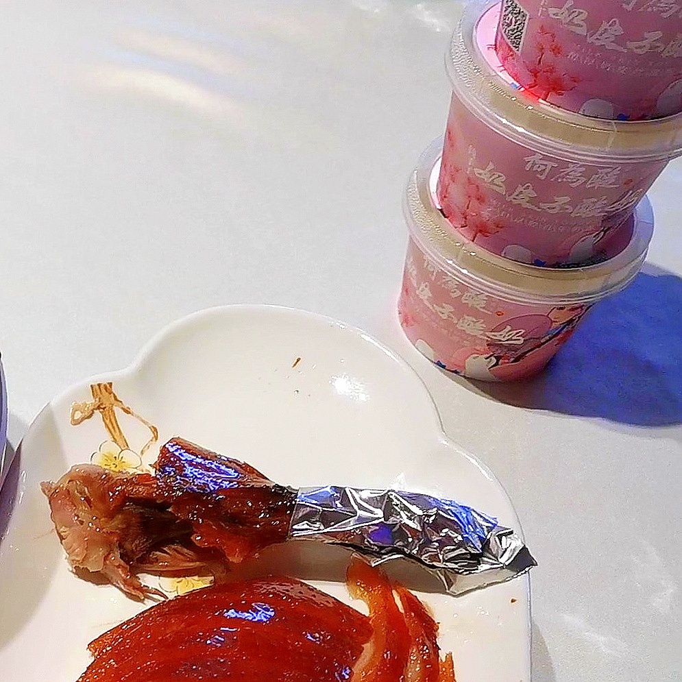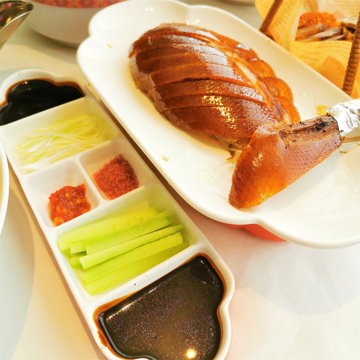烤鸭刚上桌,我们就按捺不住食欲:取一张薄如蝉翼的烤鸭饼,铺上焦香的鸭片,放上清爽的黄瓜条、脆嫩的葱丝,蘸上甜面酱,再撒些许玫瑰糖,轻轻一卷送入口中。鸭肉的鲜香焦脆与瓜条、大葱的清爽辛辣在舌尖碰撞,甜面酱与玫瑰糖的甜润恰到好处地中和了油腻,一口下去,只觉酣畅淋漓,“好爽啊!”