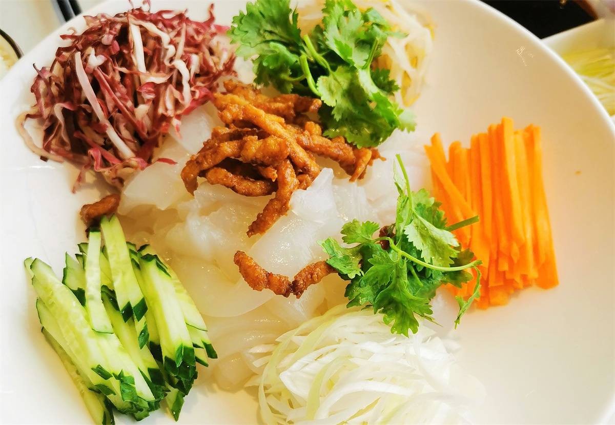 除了烤鸭,大鸭梨的京味菜也格外勾人味蕾。大刀牛肉香醇入味,大拉皮清爽滑嫩,清炒时蔬鲜嫩解腻。牛肉的厚重、拉皮的爽口、青菜的清甜,就着米饭一口口吃下,每一口都顺口又舒坦。