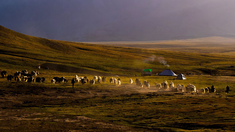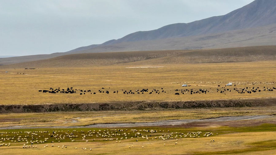 都兰县位于青藏高原腹地的柴达木盆地,拥有草原面积38 11.04万亩,其中天然牧草地3711.7217万亩:其他草地98.914万亩,人工牧草地0.4046万亩,草原综合覆盖度为52.97%。 9月中旬全县123.3088万牛羊转场完成,都兰县是青海省畜牧业资源大县。为顺应牧草生长周期与气候规律,当地牧民延续千年传统,实行季节性轮牧。(摄影/先宫 希日尖措)