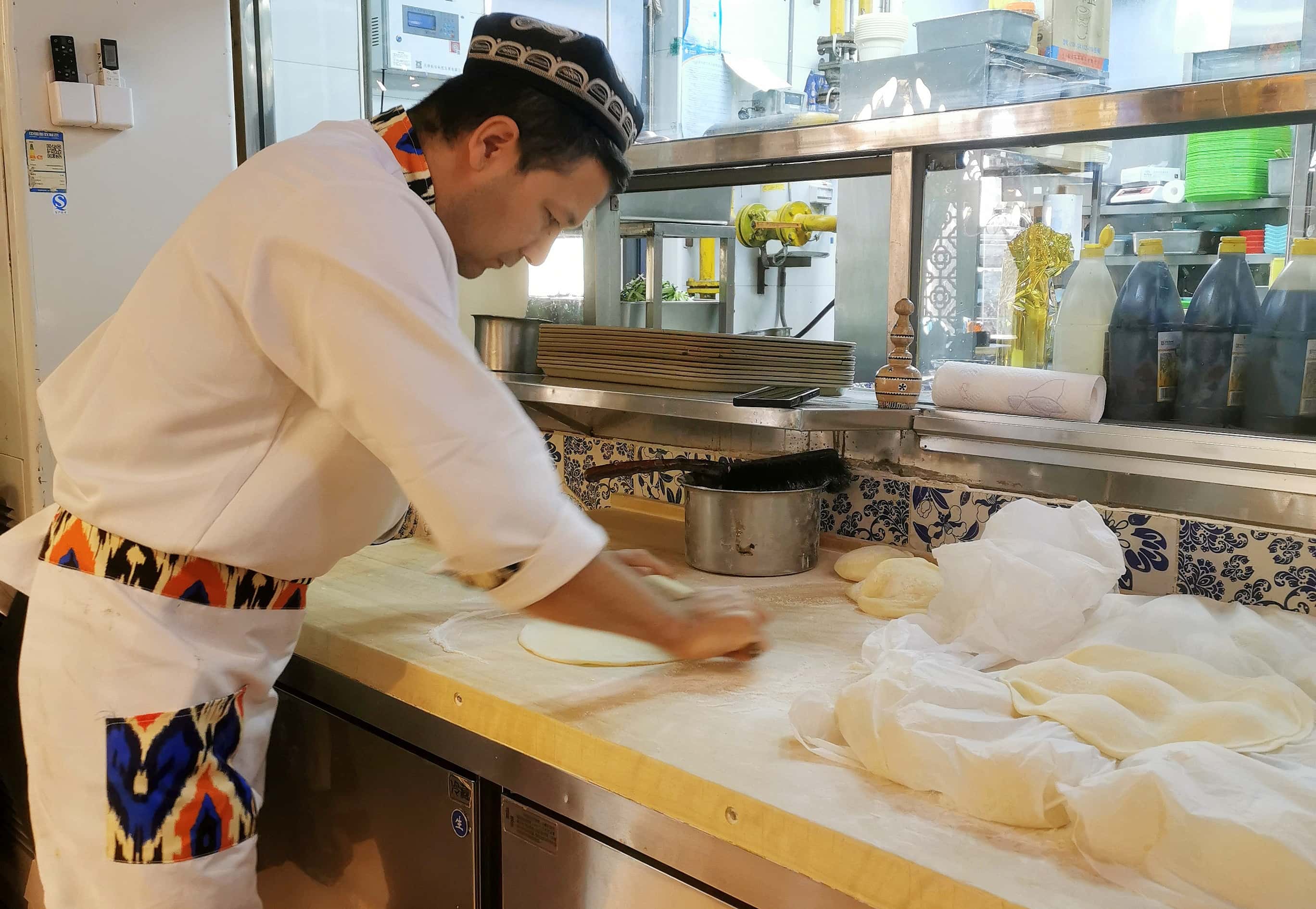 品尝完涮肉,店内的特色美食仍让人意犹未尽。新疆大厨在明档厨房现场操作,炭火上的羊肉串滋滋作响,油脂滴落的香气扑鼻而来;纯牛奶和面、不掺一滴水的馕,刚出炉时外皮酥脆、内里松软,浓郁的奶香与麦香交织,让人忍不住大快朵颐;地道的手抓饭颗粒分明,胡萝卜的清甜与羊肉的油脂香气渗透每一粒米饭,还有慢火炖制的新疆特色菜,每一道都承载着边疆的饮食文化。即便已经饱腹,也难抵诱惑打包一张热馕,边走边吃,余味悠长。