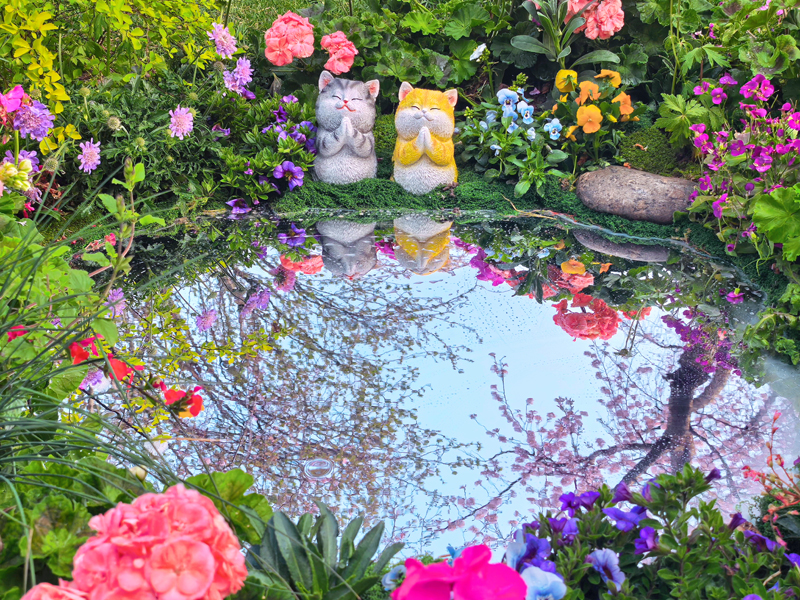 玉渊潭“樱花路”具有轻松浪漫的氛围,盛开的樱花与连翘构成绚烂背景,而萌趣十足的小兔、小猫、小鸟摆件静卧于花丛中,能瞬间吸引孩子的目光。镜面装置如同天然画框,孩子们可以通过它观察天空和花朵的倒影,激发好奇心。