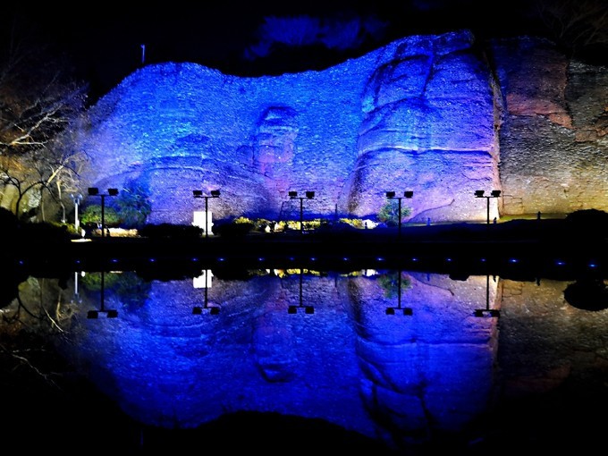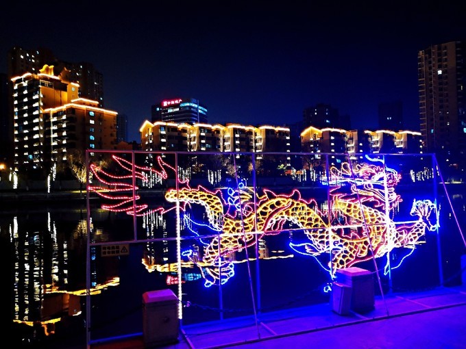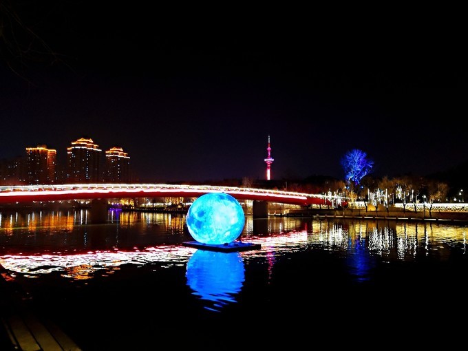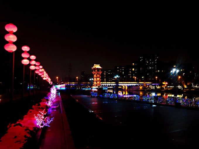 石头城游船码头扮靓后就是这样,大红灯笼高高挂,灯光亮化顶呱呱!哈哈哈,有一种仿古的感觉呀。而这块号称龟石上打上了蓝绿光,又好似宝石一样闪闪发光!鬼脸城的传说不止一次说到,而晚上的鬼脸城加上彩色灯光,还真有点面目狰狞的意思,甚是吓人啊!彩虹桥旁的秦淮河加上了灯光球,突然想到了最近特别火的电影《流浪地球》,再加上桥上的水雾,科幻片的场景!