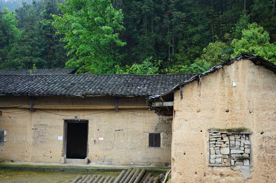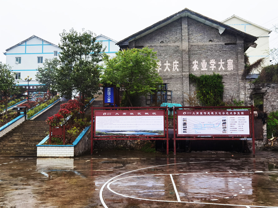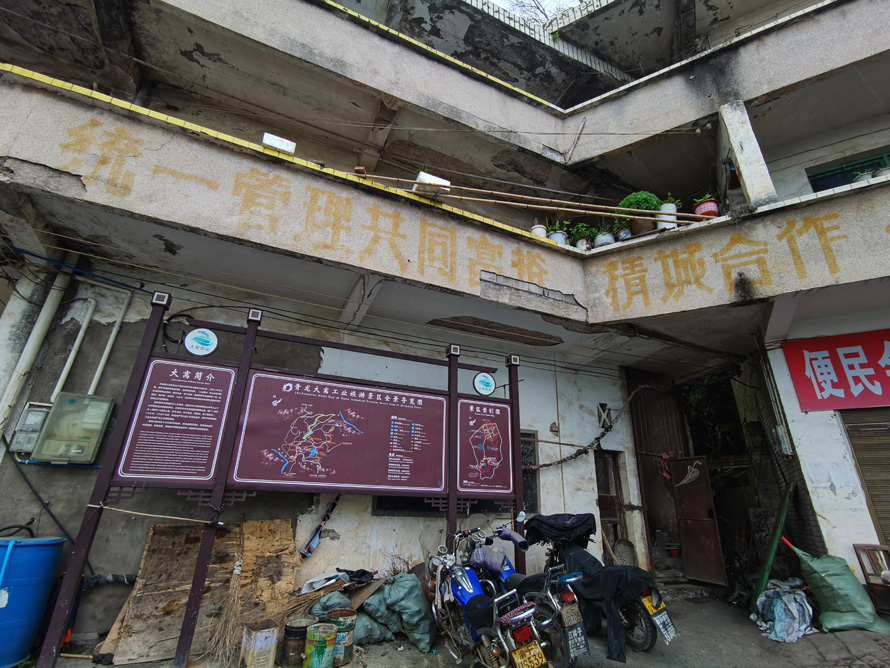 我抵达大窝景区的时候,天空下着大雨,四周大雾弥漫,能见度不足百米,身边一排排的老旧厂房和民居在林木丛前兀自矗立。车子停靠的广场上有一处宣传牌,上边是大窝的简介和导览图,视线里斑驳的房屋上还留着当年痕迹,一条村路边还设置有当年硫磺厂的简介和老照片展览。