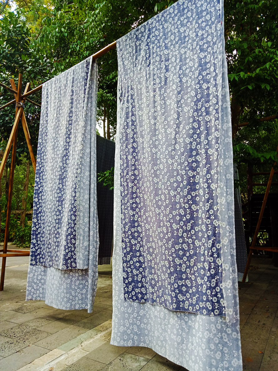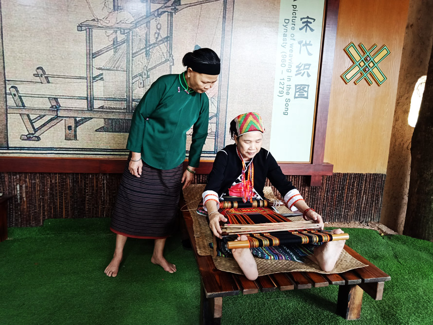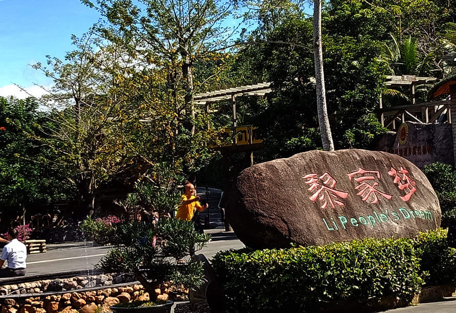 槟榔谷地处北纬18°,完全是热带气候区,听到景区门口的导游介绍,这里常年“温而不热、凉而不寒、爽而不燥、润而不潮”。“在这里你可以看到黎族藤竹编织技艺、黎族独木器具制作技艺、黎族钻木取火、黎族树皮布制作技艺、黎族传统竹木器乐等。”