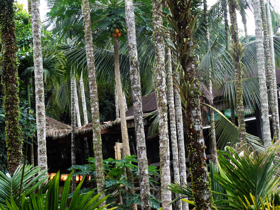 这里也属于热带雨林景观,青色或者金黄的木瓜垂悬在树干枝丫,如果你留意的话,小径边的山脚还有没有成熟的芒果,漫无边际的槟榔树宛如森林海洋,它们看上去并不粗大,但却高耸入云,当然还有各种叫不出名字的鲜花和草木。