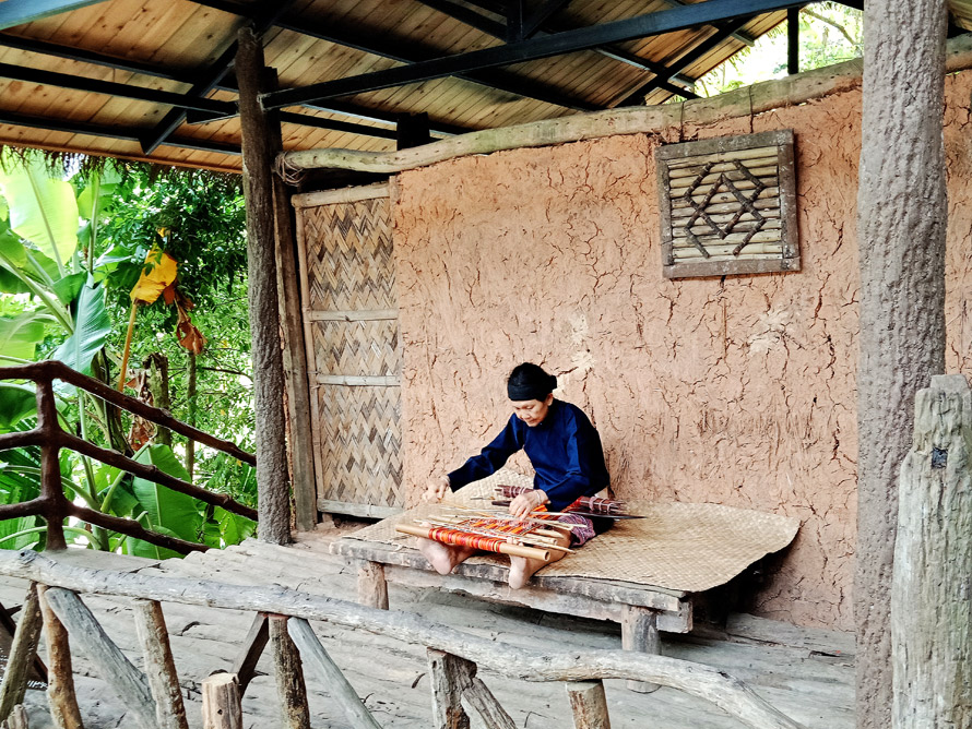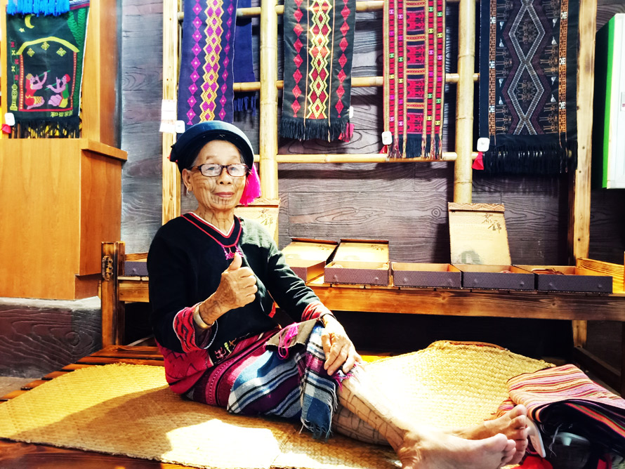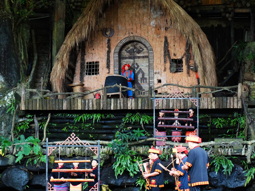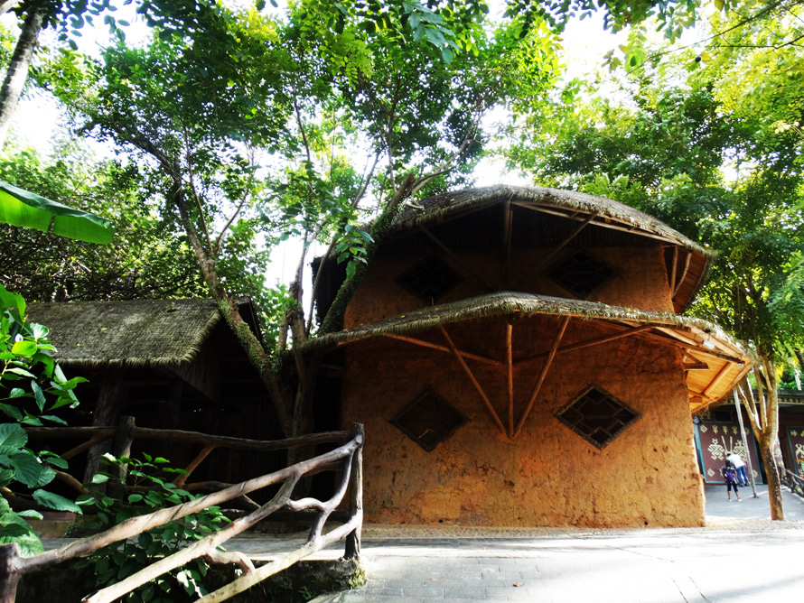 这里似乎还保留着(或许是新建的)土坯的敞开式房屋,屋顶是茅草,有上了年纪的人坐在那里纺纱织布、或者制作木器,也有的人在跳舞,还有老年人在聊天。在一群聊天的奶奶级人群中,有的老人面部纹有花纹,据说这是早年这里风俗,少女时代她们都要在面部纹上花纹,一是漂亮的象征,二是容易找到对象,倘若谁家姑娘没有纹面,就会被别人说三道四。关于少女纹面,也有说是古时部落之间打仗,女人为了不被抢夺而保护自己的一种手段,但这似乎没什么说服力,因为这一习俗被传承了下来,并形成了独有文化现象。