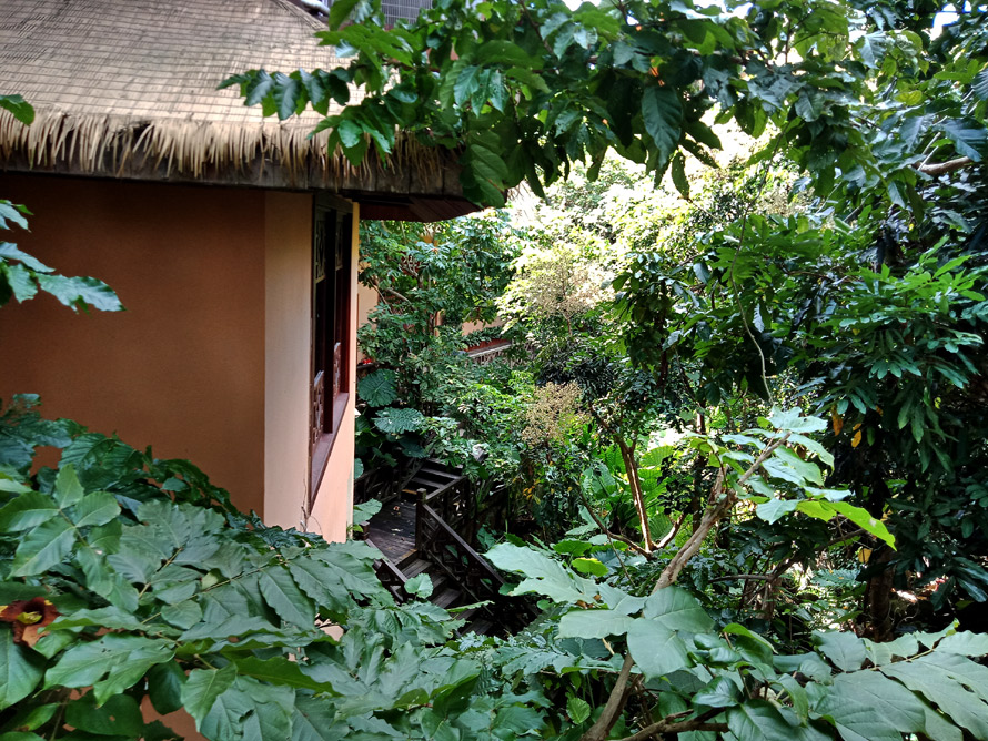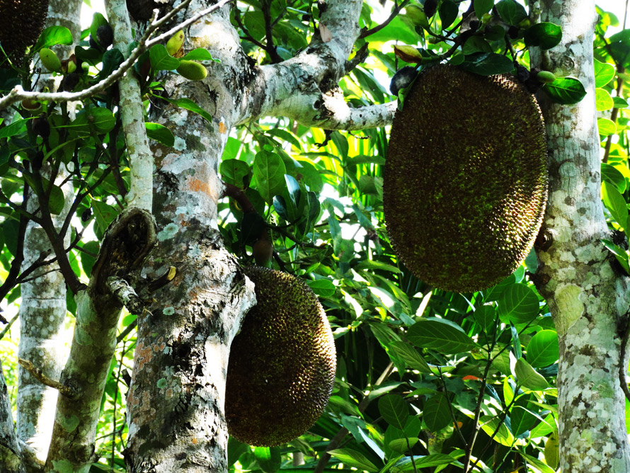 这里也属于热带雨林景观,青色或者金黄的木瓜垂悬在树干枝丫,如果你留意的话,小径边的山脚还有没有成熟的芒果……