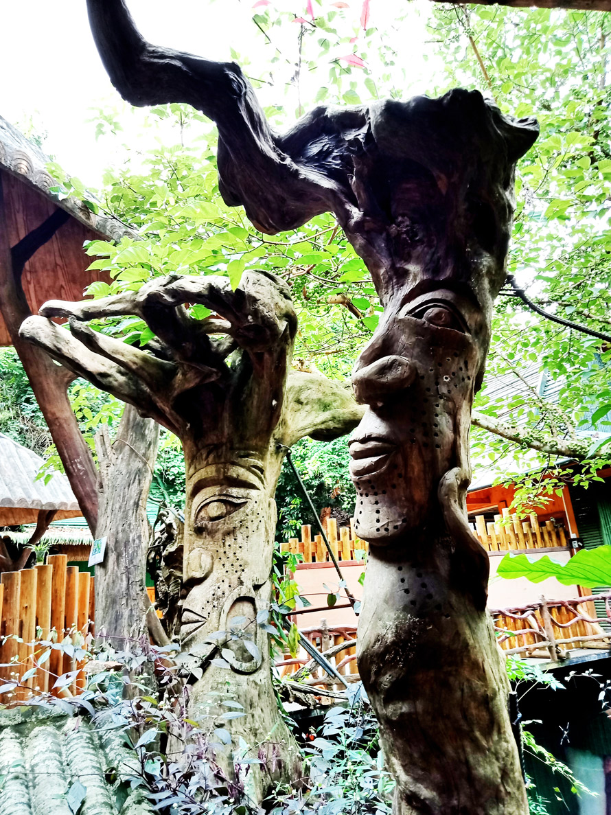 前行游览,一些颇为奇怪的木雕木刻树立在旁边,还有的建筑上刻画有神秘的图案,看着像是少数民族的图腾。