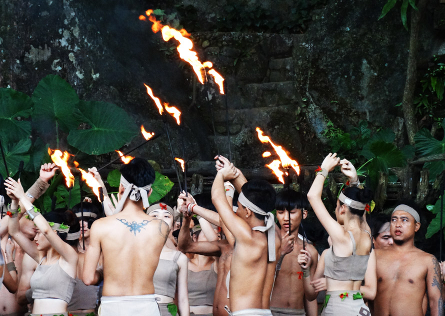 每天,这里还有一场实景演艺《槟榔•古韵》,据说参与演出的都是这里的村民,这些年轻人跳着打柴舞、唱着欢快山歌,表演着钻木取火、织黎锦、帕曼情歌、苗捏、舂米等,而早年黎家人上刀山、下火海的技艺让舞台烁烁生辉,还有人民生产、丰收和婚恋的生活场景,再现了百年甘什黎村,让人仿佛置身远古的黎族部落。