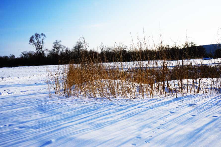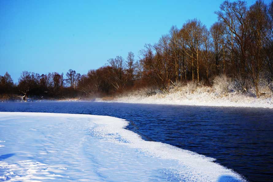 我们深一脚浅一脚在雪中行进,不知走了多久,朋友说,看,那条河就是不冻河,我们马上就到“十里画廊”了。随着朋友的指引,远远向前方望去,果然在白茫茫的雪原上,有一条黑色的带子蜿蜒而过,飘逸而醒目。