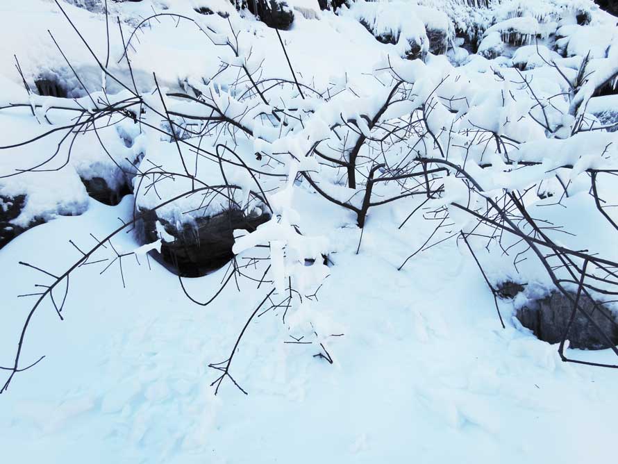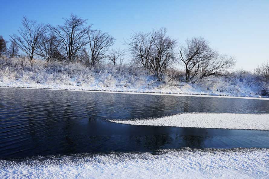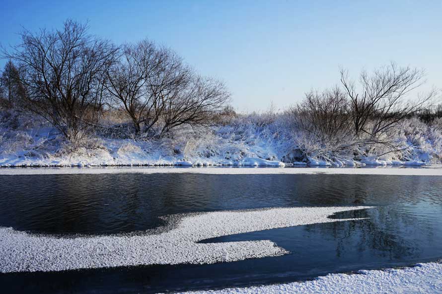 沿河流张望,那冰雪羽衣绵延数里,形成巧夺天工的雾凇和冰挂,的确美不胜收,各种造型的冰挂晶莹剔透,珍宝般悬挂于草尖、枝丫;结冰的河水和流动的河水相互依偎蜿蜒,在洁白的雪原上勾勒出界限分名的线条,自然而灵动。