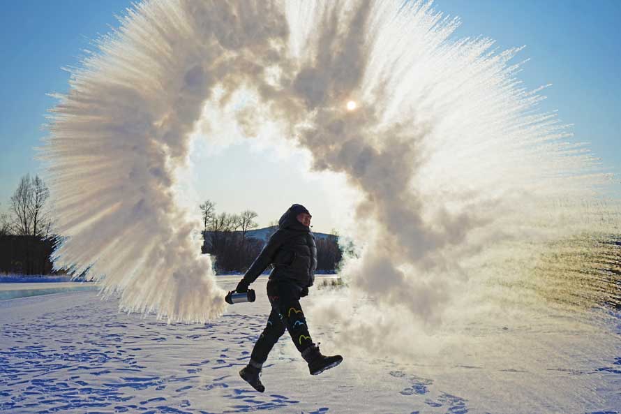 朋友说,滴水成冰让你见识下。说着他送背包里拿出了一个暖水壶。只见他拔掉瓶塞,然后喊道一二三,随着他将水壶用力向上泼去的力道,一条巨大的白色水雾顷刻间将他笼罩,随之落下来的竟然是一片冰碴。他说,这样玩丝毫不用担心热水会烫着自己,因为热水在出来的一瞬间就被雾化成冰雪了……的确,极寒的天气里,开水会瞬间结冰。