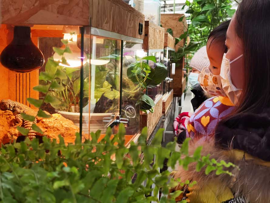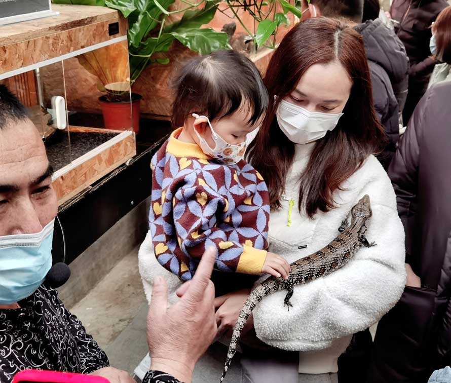 在蜥蜴展区,各种蜥蜴在自己的区域自由活动,有的蜥蜴很小,有的则很大,长相如同恐龙,或者说像鳄鱼。工作人员说大蜥蜴力气也很大,如果空间足够,蜥蜴摆尾猛扫话能把玻璃打碎。也有的稍微小一些的蜥蜴,脾气温顺,说着拿出一只蜥蜴,放在一个抱着孩子的妈妈胳膊上,小孩子用手去抚摸,动物与人和谐相处的样子颇为欢乐。