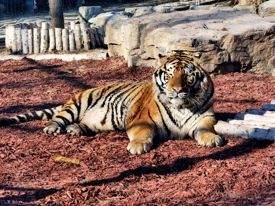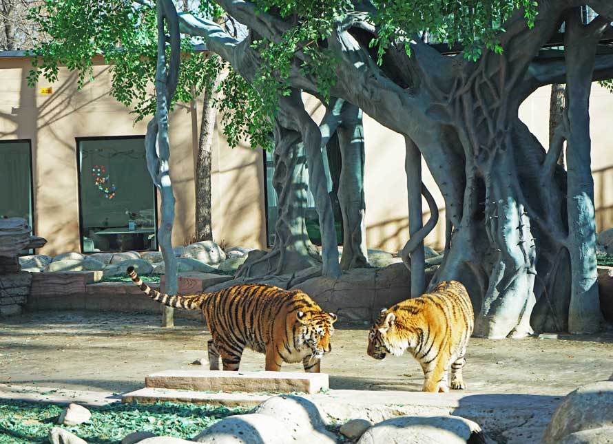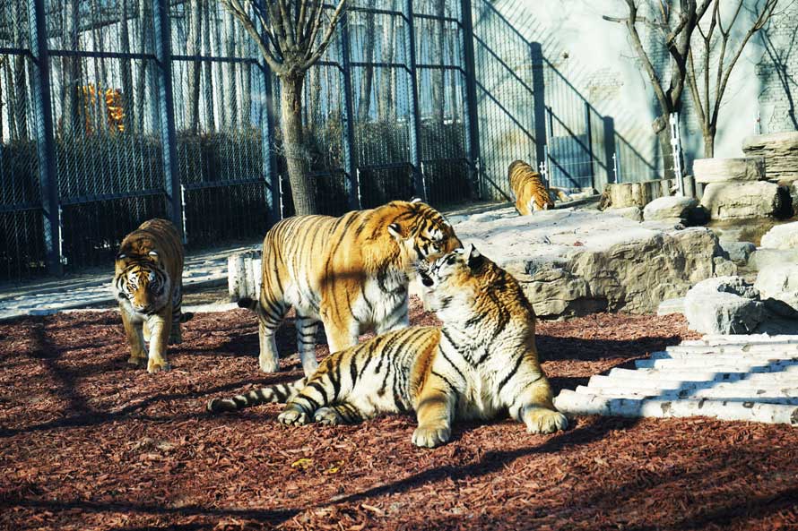 老虎是大人孩子都喜欢观看的动物,它们一会在假山上奔跑,一会在空地上嬉闹,在地上打滚或者卧倒,样子就像超大版的猫咪。它们还会沿着玻璃走来走去地散步,游客在玻璃墙外与它们合影、或者拍照,小孩子也会隔着玻璃去触摸老虎。