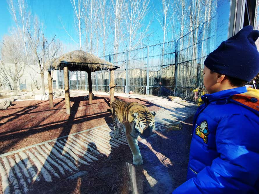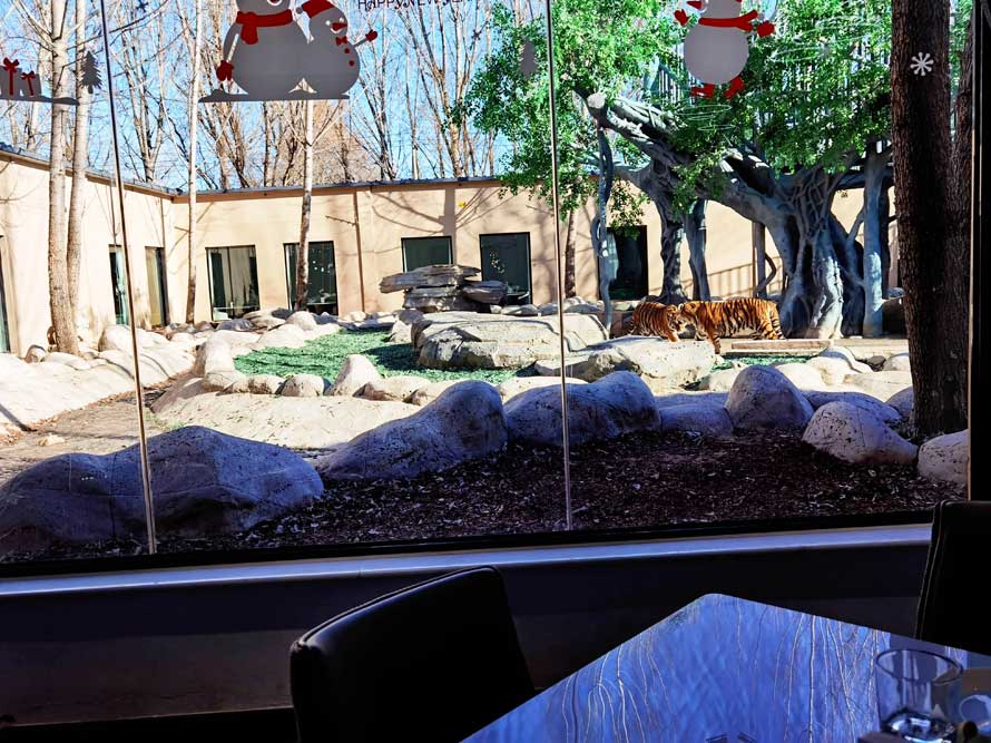 最值得一提的还有这里的老虎餐厅,餐厅的建筑与内饰自不必说,看上起颇有小资调调,进去后,一侧是玻璃墙,墙外面就是老虎,也就是说,游客可以一边吃饭,一边观虎斗。当然,它们貌似没有打架的时候,只是在领地里散步或者嬉闹,间或盯着玻璃外面的人。与虎共进午餐,这样的就餐环境貌似我之前从来没见到过,在北京地区应该也是独一无二,颇有网红潜质。