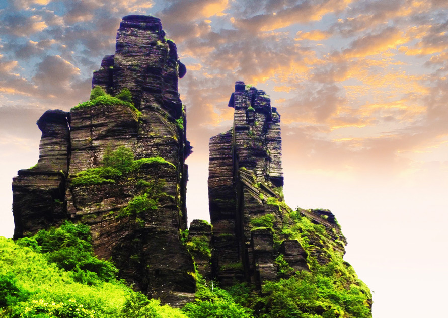 圣山仙境,地异灵鹫,黔山万道重重锁,挡不住梵净山奔流不息的缭绕气韵,当你站在万卷书前的观景台上,在雾霭流岚中欣赏着蘑菇石、老鹰岩、万卷书等惟妙惟肖、栩栩如生的景致,你会立刻感到大自然的鬼斧神工的超凡魅力,这些经过千万年大风雕琢而成的石头,让人充满神奇的想象。