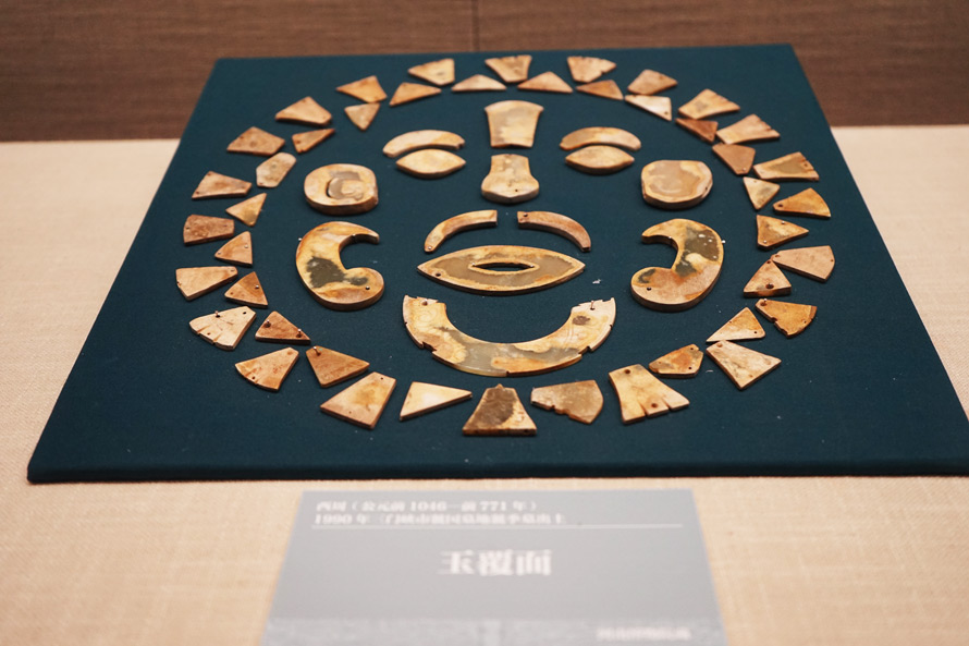 印象比较深的要数玉覆面,又叫缀玉面罩,据说是金缕玉衣最早的形状,之后朝代中出现的金缕玉衣就是按照这个制作而成。博物馆里的玉覆面来自西周时期,1990年三门峡市虢国墓地出土,仿人的脸部特征特制的玉件,缀联在一块布帛上,只有古代贵族才能使用,此类物件在山西、陕西都有出土过,也都是同一时期。