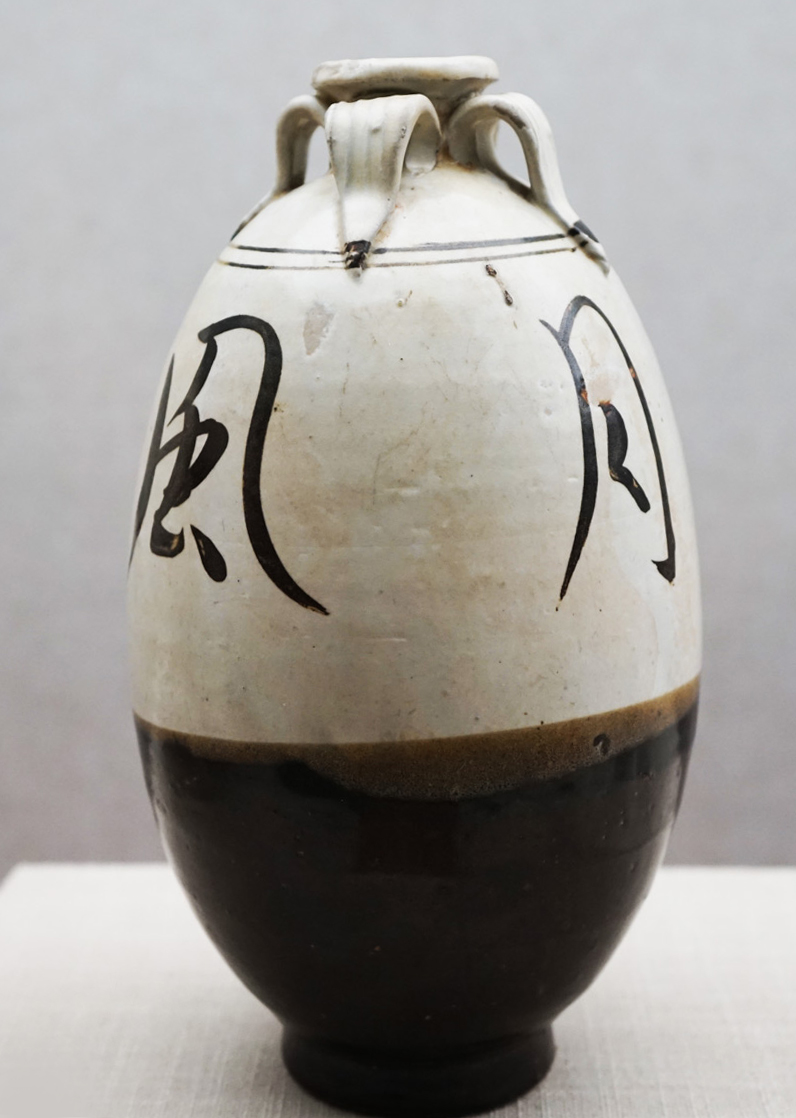 在另一处展柜,一只白釉黑彩的瓶子吸引了我的目光,这只瓶子看起来古拙质朴,通体披泽,目光落在上面仿佛有温度般让人想触摸一下。它出土于河南省会郑州地区,瓶身白底明釉,小口短颈,瓶子腹部是草书写的“风花雪月”四个字,笔迹流畅,线条明朗,不知道谁人所书。