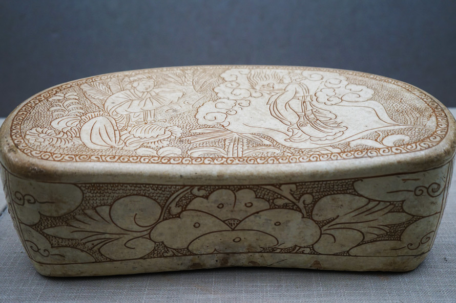 翻阅了一下史料,发现这种瓷器最早开始于隋,后来发展于唐,在盛唐时期,瓷枕也被用来中医诊脉,历史进入宋朝的时候,瓷枕的烧造与制作工艺开始空前繁荣,“各种技艺烙、刻、划、剔、印、堆塑等运用到了瓷器的装饰技法上”,这让大宋的陶瓷更加光彩夺目,洋溢着乡土气息,浓缩着生活情趣,从而为后世存贮下来彼时的民风、民俗,以及粗茶淡饭中飘洒出来的诗情画意,也让我们得以窥见历史深处的静寂喧闹。