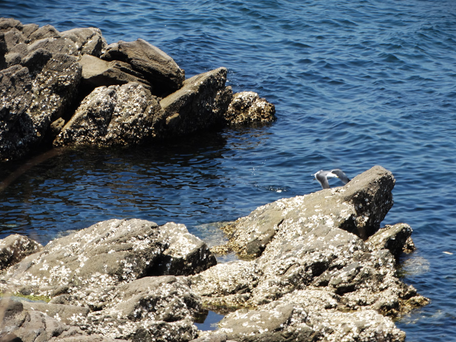 沿着曲折的小径前行,礁石间的道路忽上忽下,曲径通幽里却有毫不张扬的自然与宁静美。栈道的尽头是一路需要攀爬的台阶,台阶的顶端是一座叫做“惹浪亭”的长形亭子。名字够浪漫的,是因了这座亭子,海浪才更加肆无忌惮么?才引得万顷波涛拍岸卷起千堆雪?亭临海而立,渐次跃于海面,于远处观看,恰似飞峙于万顷波涛之上,立身于千层浪涌之中,大有招波惹浪之态。