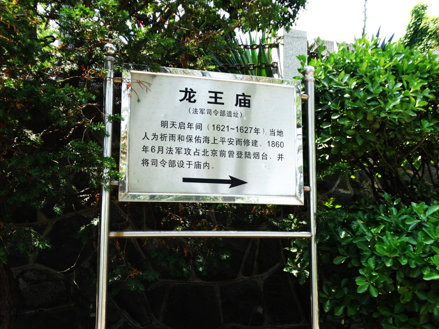 烟台山上有一座龙王庙,坐南朝北,面对大海。传说在明代天启年间,也就是1621-1627年间,烟台连年大旱,庄稼颗粒不收,当地人们在烟台山建起一座龙王庙,祈祷龙王赐雨,普救苍生。说来也巧,庙刚修好,大雨从天而降,旱情顿解,民众便以为是龙王显灵,从此庙里香火不断。庙门口一块牌匾显示,在1860年时候法军登陆烟台,并将龙王庙设置成了司令部。