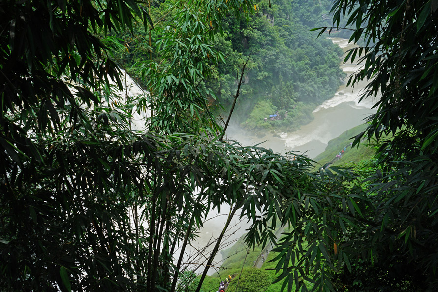 我抵达的这里的时候,车子还没到景区,便在附近的路上透过苍翠的林木缝隙看到巨大的瀑布,轰然作响。进入景区后,沿台阶下行大约5分钟,便到了瀑布的下方,瀑布下面的潭水叫犀牛潭,深17米,奔腾的瀑布从几十米高的悬崖绝壁上直泻潭中,激起一朵朵晶莹的浪花,卷起一个个漩涡。那轰鸣的水声震耳欲聋,那溅起的水珠向四面飘洒,天气晴好的时候,阳光折射出七色彩虹。