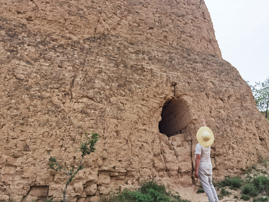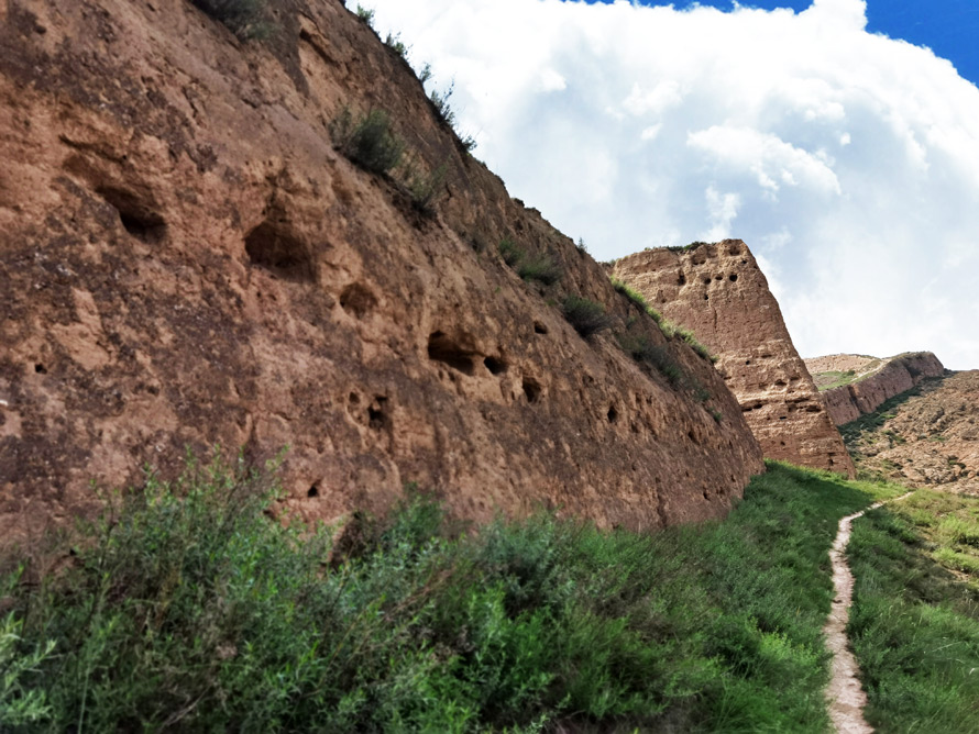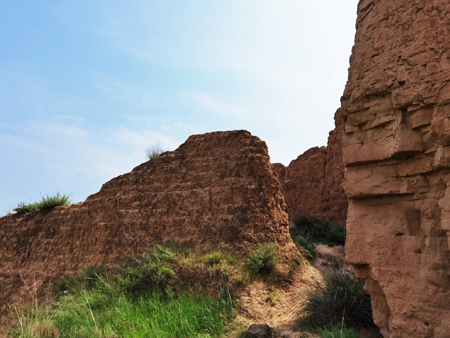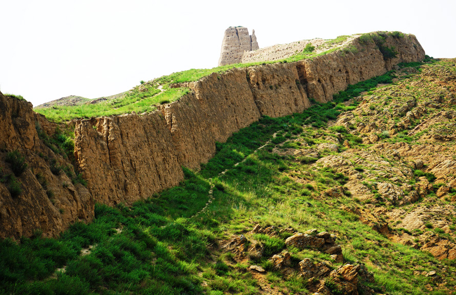 沿着黄沙碎石铺就的小路顺坡而行,一侧的城墙粗糙而坚实,虽然是坍塌的残垣断壁,但依旧泛着遥远的雄伟与壮观,散发着令人着迷且兴奋的魅力。一路向上景色不断变化,山体由土变石,风化的岩层上,不知名的劲草扎根,一团团一簇簇,在朔风中摇摆。