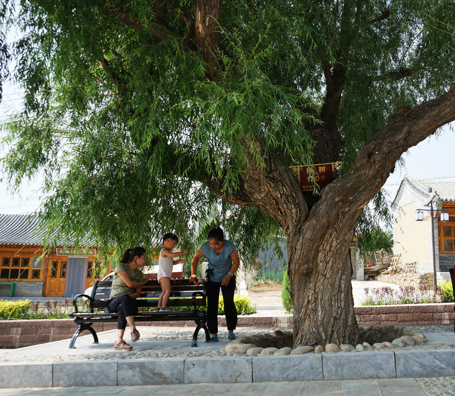 站在村口,远远望去,黛色的长城、雄辉的山脉、精致的村庄构成一幅艳丽的水彩画,小村子就挂在画轴底部。路两侧仿古商铺有序相邻,村后山腰,庭院层叠,回廊环绕,花格菱窗,人景相谐的山水田园景致,营造出一种怀古读诗的文雅气象。村子里的古树遍布房前屋后,休闲小广场和民宿散落在村子中央。长城环抱的李二口村,有传统的田园色彩,更有现代物质的光华。