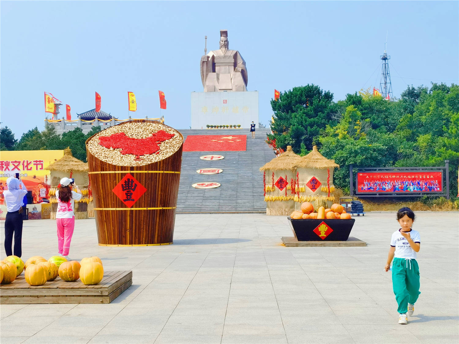 幸福大道:轩辕牌坊前梯形仓装了各种南瓜,轩辕牌坊上挂着一串串红南瓜,寓意幸福之门。神路两侧晒玉米、稻谷、装饰6600个柿子寓意事事如意,幸福安康。