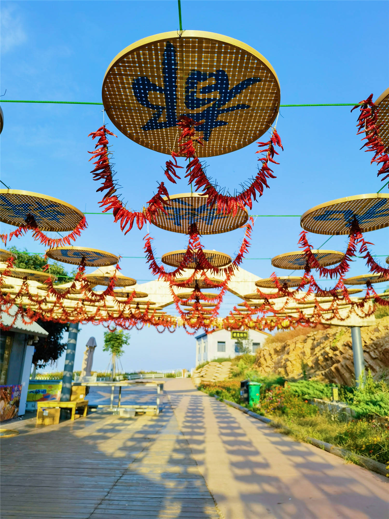 红红火火长廊:索道上站出口这里有个长廊,上面有100个筛子组成的百家姓,中间悬挂有红彤彤的辣椒、灯笼,拍照非常漂亮。