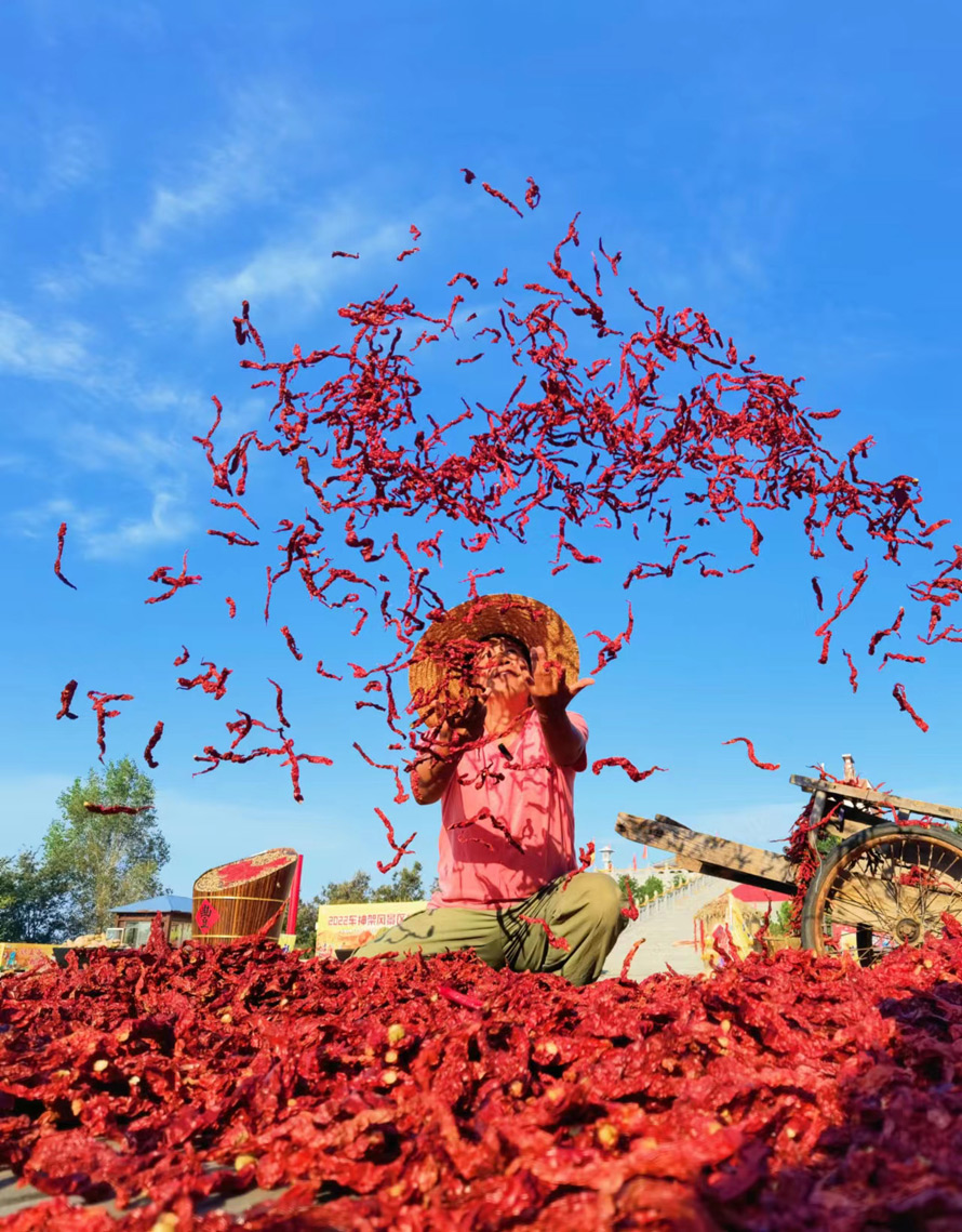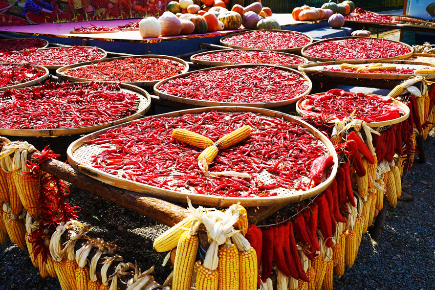 游览间,看到有三五游客在一堆红辣椒前拍照,只见他们揽一怀辣椒抛向空中,那散如花开的红,刹那间映出发自肺腑的笑容,点缀了一方山川,美化了一段旅程。