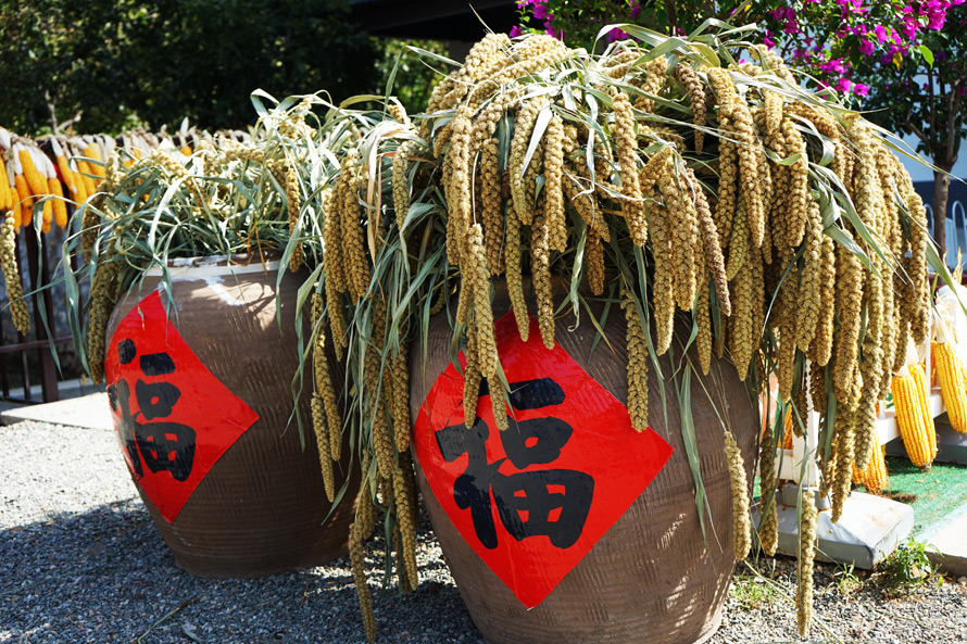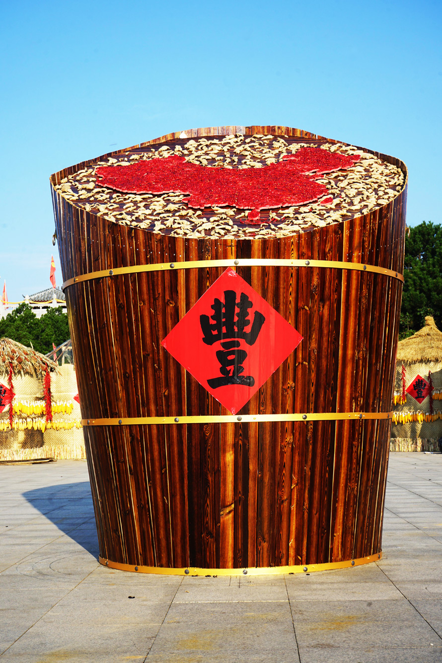 广场一侧,是一溜木质的架子车,车子上装满了金黄的南瓜和玉米棒,间或有几只盛放粮食的木质器皿,其中一只木质器皿呈V型,里面分为五个空间,装有五种不同的粮食,这让我想起中山公园里的五色坛,五色坛又叫社稷坛,是古代帝王祭祀土地神和五谷神的场所,也是皇权、国土和谷物收成的象征,明清两朝皇帝每年都要在这里举行祭祀仪式,祈求国泰民安、五谷丰登。这里的呈V型木质器物一定是从中国传统文化中传承而来,代表这华夏大地五谷丰盈。遗憾的是,当时没意识到这个木质器物深刻的文化内涵,回来看视频的时候才意识到,只好以视频截图放在这里,期待下次去能够仔细欣赏。