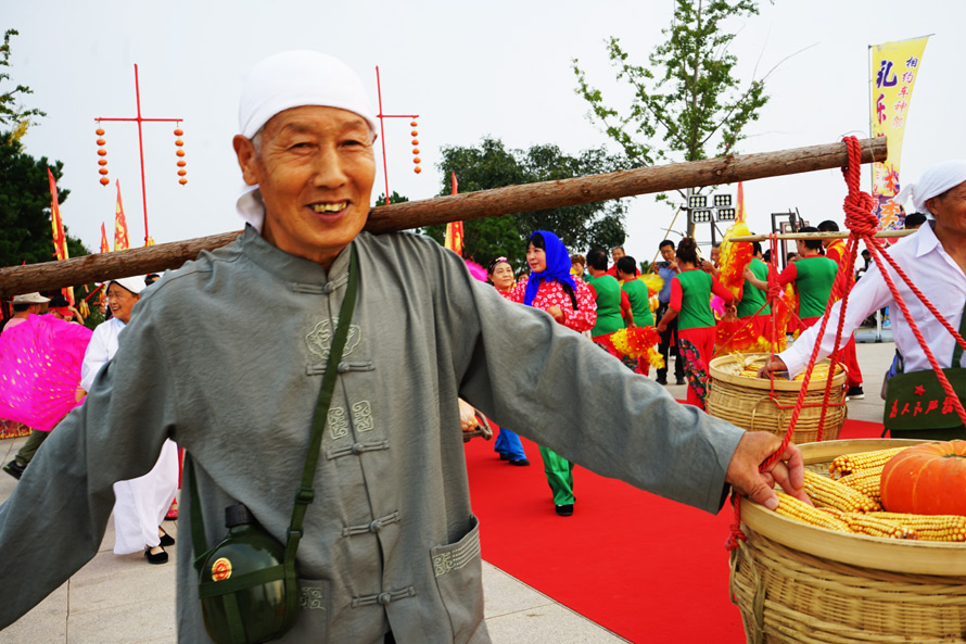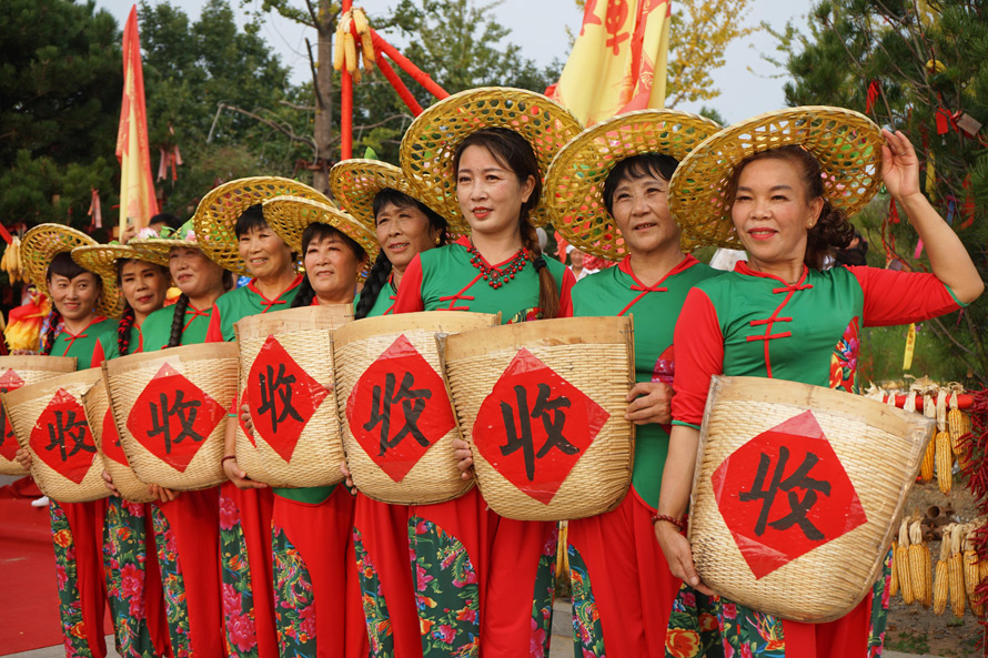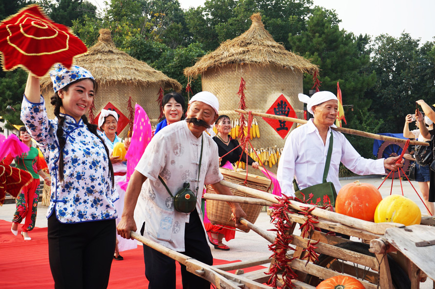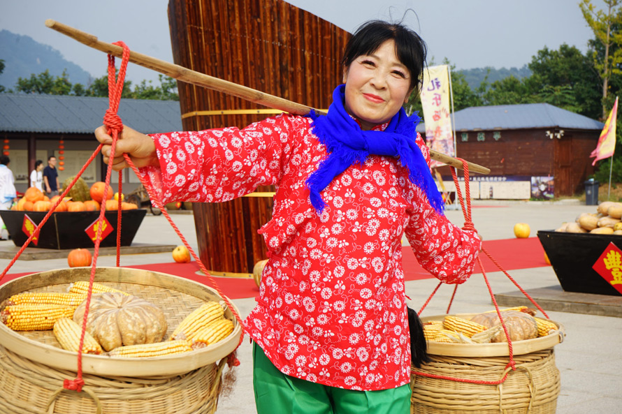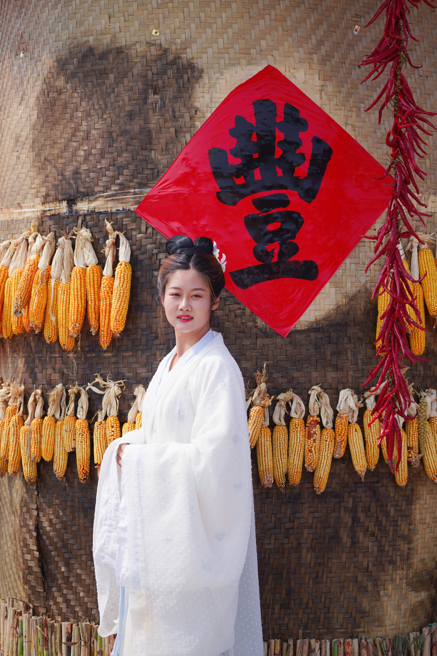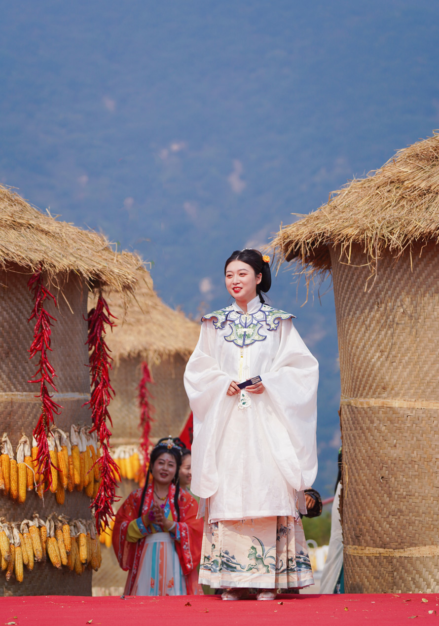 轩辕广场上有欢快的锣鼓响起,是一支民间表演队在这欢庆丰收的演出,他们精气神十足地舞龙、扭秧歌,甚或还原着挑粮回家的场景,这欢天喜地庆丰收的热闹景象一下子在山川间铺陈开来。而另一边,一些身着汉服的“小姐姐”在舞台上走秀,它们以粮仓为背景,以南瓜玉米辣椒为衬托,构成了一幅绝美图画。
