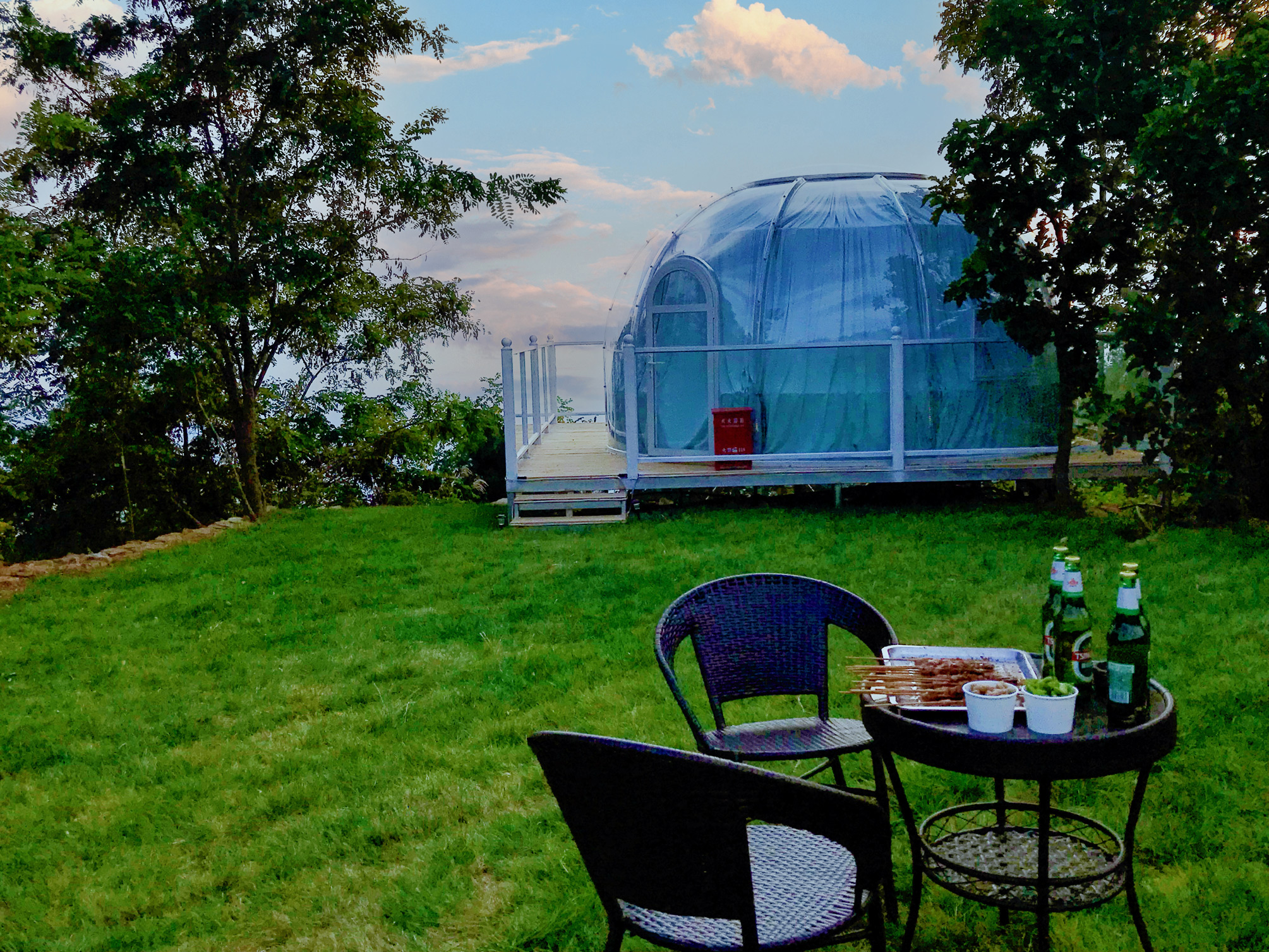 夕光隐没层峦之际,有风起山岚,倘若你不想回程,完全可以选择在这里住宿露营,有房车和帐篷以及泡泡屋,它们矗于山崖隐于丛林,晚霞寂照的时候,营地灯光次第亮起,与天色遥相呼应。