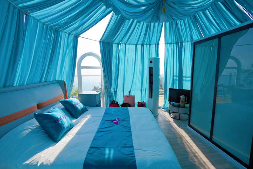 这里的泡泡屋令人惊艳,室内的帐幔水波般垂落,随手拍一张照片,似乎坐拥一片大海般令人兴奋。