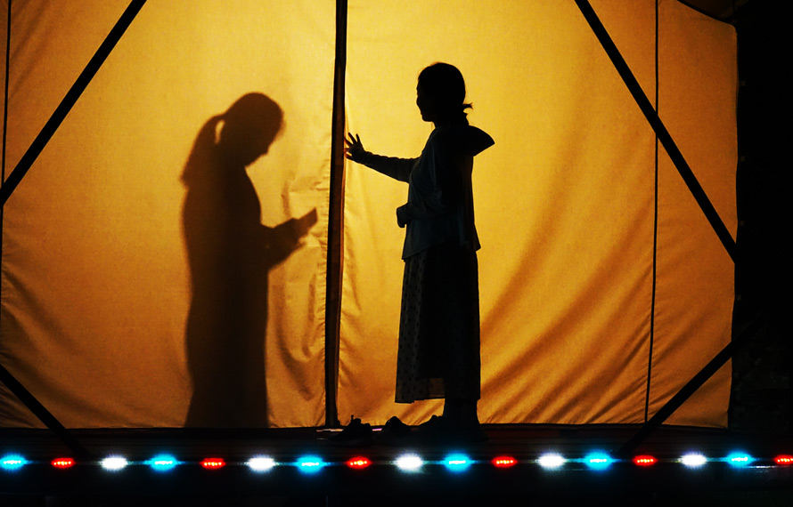 打开帐篷内的照明灯,从外面看帐篷宛如一块幕布,如果你坐于帐篷前的木台之上,立马呈现出一幅美妙的剪映,倘若此时有人配合“演出”,那一定可以看作是剧情上演的前奏。帐篷内的住宿设备一应俱全,不亚于高端民宿。