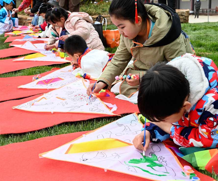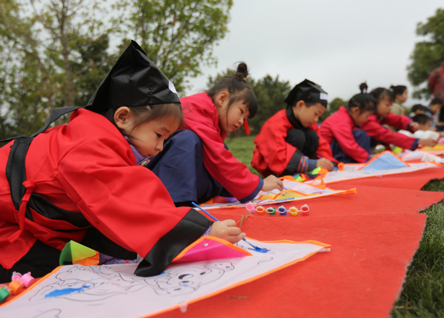 可以和孩子一起扎风筝,画扇面,穿汉服,广场尽头有汉服馆。