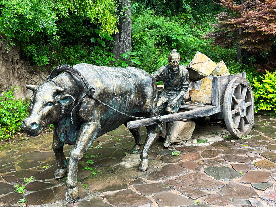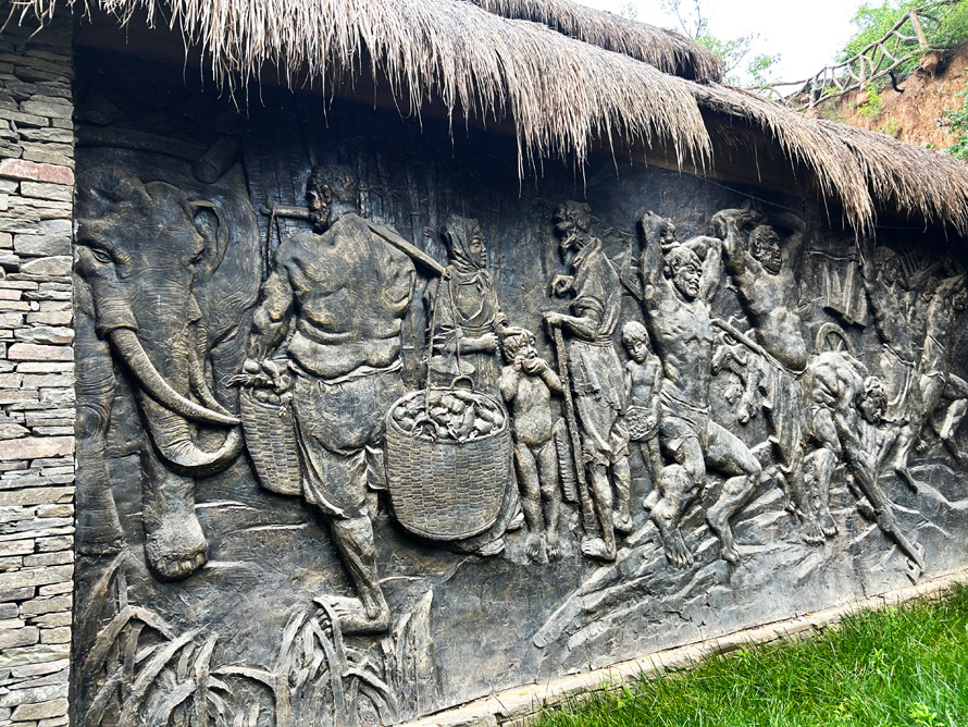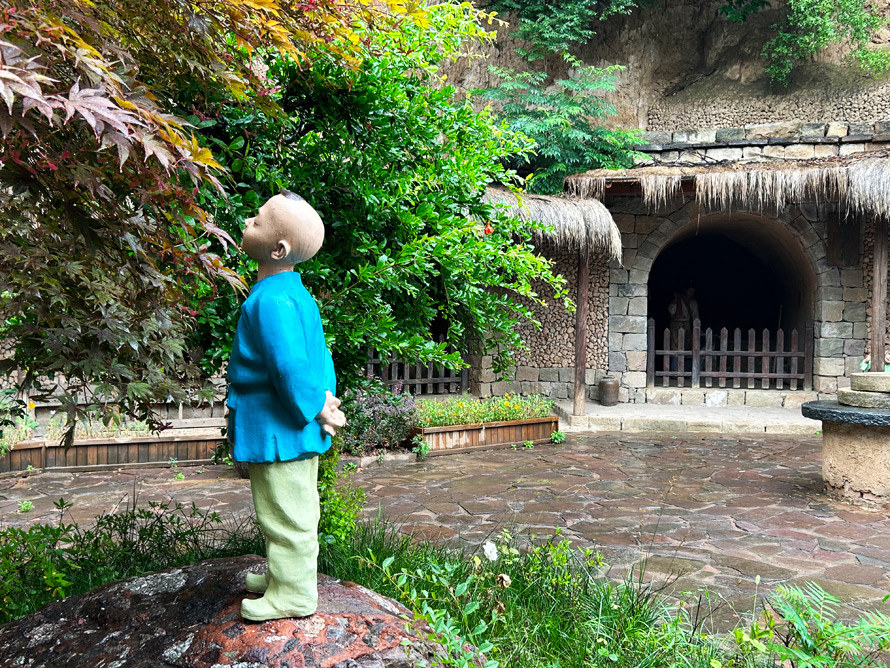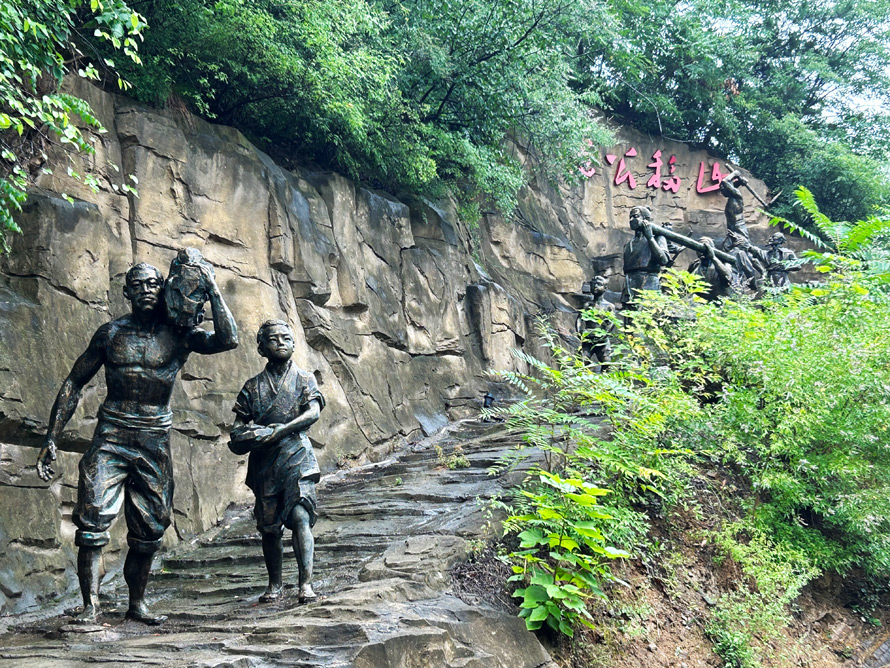 在村子的一处悬崖山道上,有一些村民搬运石头的雕塑,这或许是愚公年代的场景吧,当然也可能是早年这里的村民开山造路的情境。