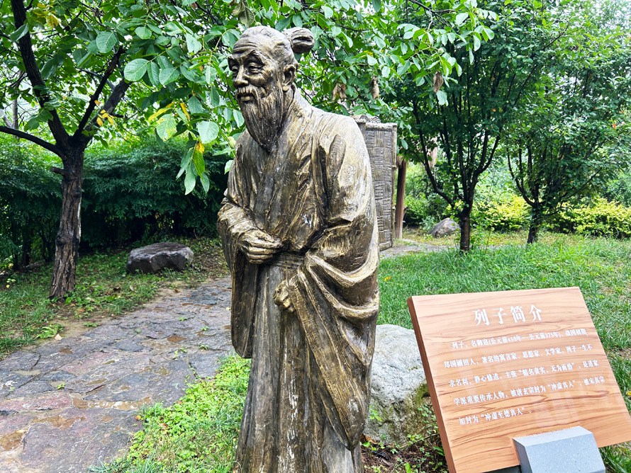 一尊列子的塑像伫立在一处庭院,也在历史的深处,不知道在千百年前他是否抵达过这里,但似乎无论是否抵达都不影响他的思想穿越浩瀚的时光照射在今日的大地。庭院里参天古木遮天,如果是在阳光灿烂的日子,这里必定也凉爽惬意之极,大树下、院墙头三两个顽童在做游戏吧,这还原了乡村童年的场景真切有趣。