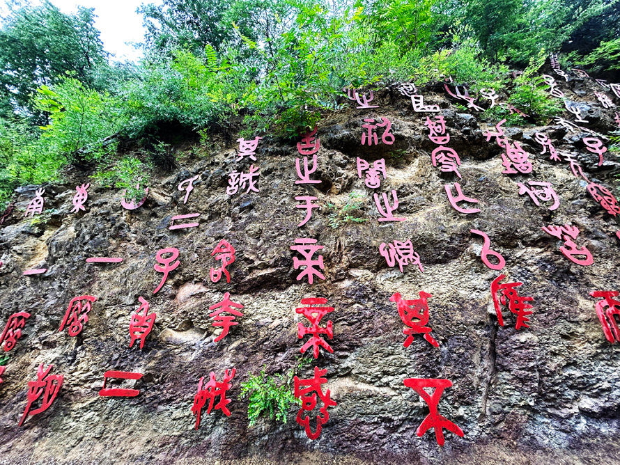 进村的山路幽静湿润,苍翠的植被肆意而茂盛地生长在视线里,或许是为了发展旅游的缘故,这里的村民早年被动迁,如今只是一些古旧院落和一些为了旅游而设置的文化元素。