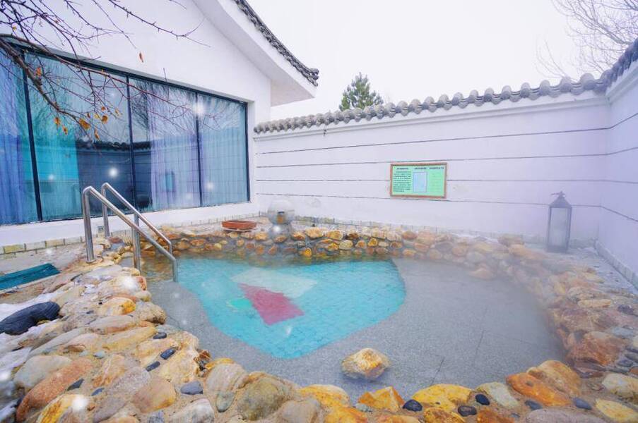 如果是想要感受情侣、闺蜜、或三五好友体验包场泡汤,可以去边上的唐宫温泉别墅,灰瓦白墙,这里建筑风格复古风格十足,接待处还有汉服可提供。室内外都有温泉池,娱乐房,私密性很好,也很适合带孩子家庭。