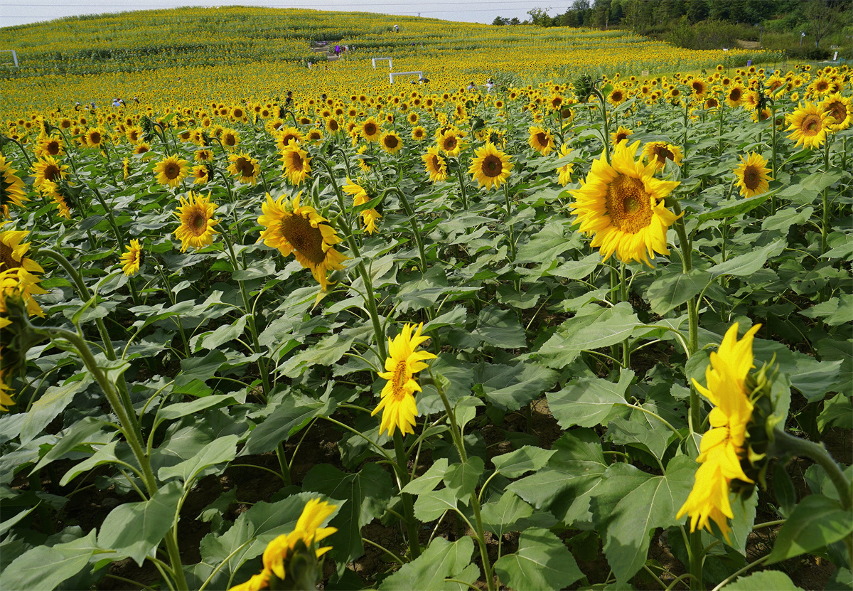 西园的核心看点丰富多样,茑屋、沁湖—阳光沙滩、芸上梯田等景观各具特色,其中最引人注目的当属芸上梯田。秋日暖阳下,漫坡的向日葵绽放出金灿灿的花盘,站在高处俯瞰,整片花田如金色海洋般壮观,随手一拍都是绝美风景。