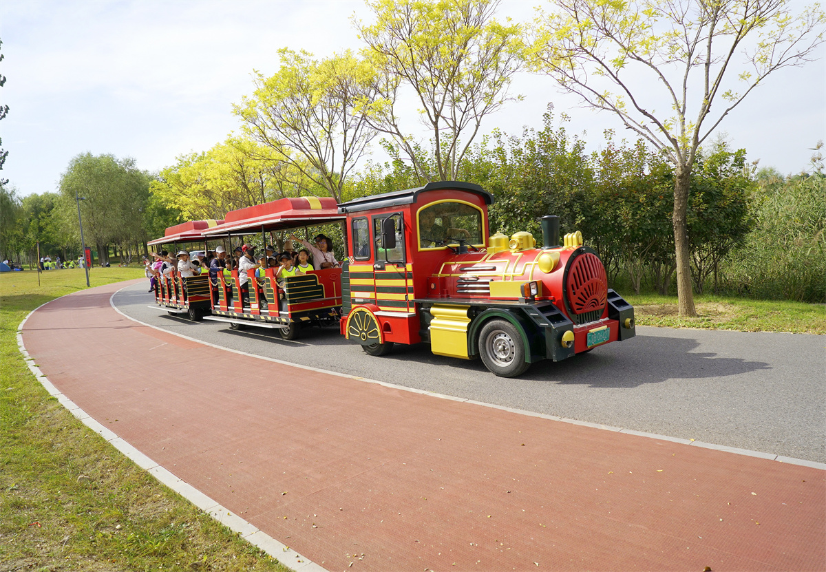 值得一提的是,西园仅是温榆河公园的一小部分,整个园区面积广阔。若想全方位感受园景,可选择徒步沿着步道慢慢逛;若想节省体力,也可乘坐观光小火车、伴游机器人,或是租借脚踏车;遛娃家庭还可租一辆共享童车,轻松带娃游园。秋日里游走在这样的郊野公园中,既能亲近自然,又能感受野趣横生的休闲时光,实属难得的惬意体验。